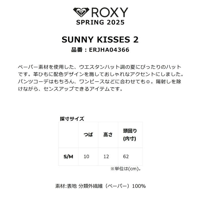 メーカー希望小売価格はメーカーカタログに基づいて掲載しています商品説明モデル名ROXYSUNNY KISSES 2定価:5000+(税)サイズS/MカラーYEF0概要ペーパー素材を使用した、ウエスタンハット調の夏にぴったりのハットです。革ひもに配色デザインを施しておしゃれなアクセントにしました。パンツコーデはもちろん、ワンピースなどに合わせても◎。陽射しを除けながら、センスアップできるアイテムです。素材分類外繊維(ペーパー)100%サイズS/M:頭囲62cm※注意事項●返品について●お客様都合によるご注文後の返品・キャンセル・交換は一切受け付けておりませんので、予めご了承下さい。●商品画像について●撮影状況、PC状況により、色合いが若干異なる場合がありますので、ご了承の上ご購入ください。●商品欠品について●掲載されている全ての商品は実店舗・他のネットショッピングでも販売しております。ご注文を承り次第在庫を確保しますが、完売の際はご容赦下さい。 ●送料について●北海道・沖縄・離島等の場合、別途送料が必要となります。