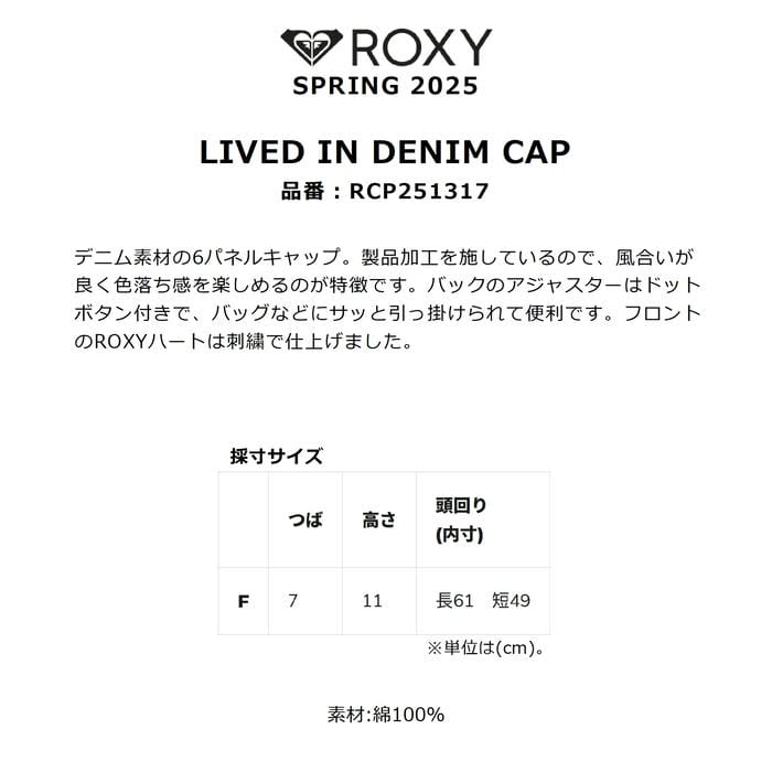 メーカー希望小売価格はメーカーカタログに基づいて掲載しています商品説明モデル名ROXYLIVED IN DENIM CAP定価:4200+(税)サイズFカラーBLK , IND概要デニム素材の6パネルキャップ。製品加工を施しているので、風合いが良く色落ち感を楽しめるのが特徴です。バックのアジャスターはドットボタン付きで、バッグなどにサッと引っ掛けられて便利です。フロントのROXYハートは刺繍で仕上げました。素材綿100%サイズF/頭囲49-61cm※注意事項●返品について●お客様都合によるご注文後の返品・キャンセル・交換は一切受け付けておりませんので、予めご了承下さい。●商品画像について●撮影状況、PC状況により、色合いが若干異なる場合がありますので、ご了承の上ご購入ください。●商品欠品について●掲載されている全ての商品は実店舗・他のネットショッピングでも販売しております。ご注文を承り次第在庫を確保しますが、完売の際はご容赦下さい。 ●送料について●北海道・沖縄・離島等の場合、別途送料が必要となります。