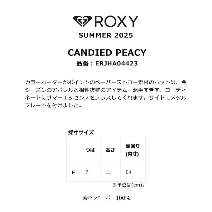 メーカー希望小売価格はメーカーカタログに基づいて掲載しています商品説明モデル名ROXYCANDIED PEACY定価:5000+(税)サイズFカラーYEF0概要カラーボーダーがポイントのペーパーストロー素材のハットは、今シーズンのアパレルと相性抜群のアイテム。派手すぎず、コーディネートにサマーエッセンスをプラスしてくれます。サイドにメタルプレートを付けました。素材ペーパー100%※注意事項●返品について●お客様都合によるご注文後の返品・キャンセル・交換は一切受け付けておりませんので、予めご了承下さい。●商品画像について●撮影状況、PC状況により、色合いが若干異なる場合がありますので、ご了承の上ご購入ください。●商品欠品について●掲載されている全ての商品は実店舗・他のネットショッピングでも販売しております。ご注文を承り次第在庫を確保しますが、完売の際はご容赦下さい。 ●送料について●北海道・沖縄・離島等の場合、別途送料が必要となります。