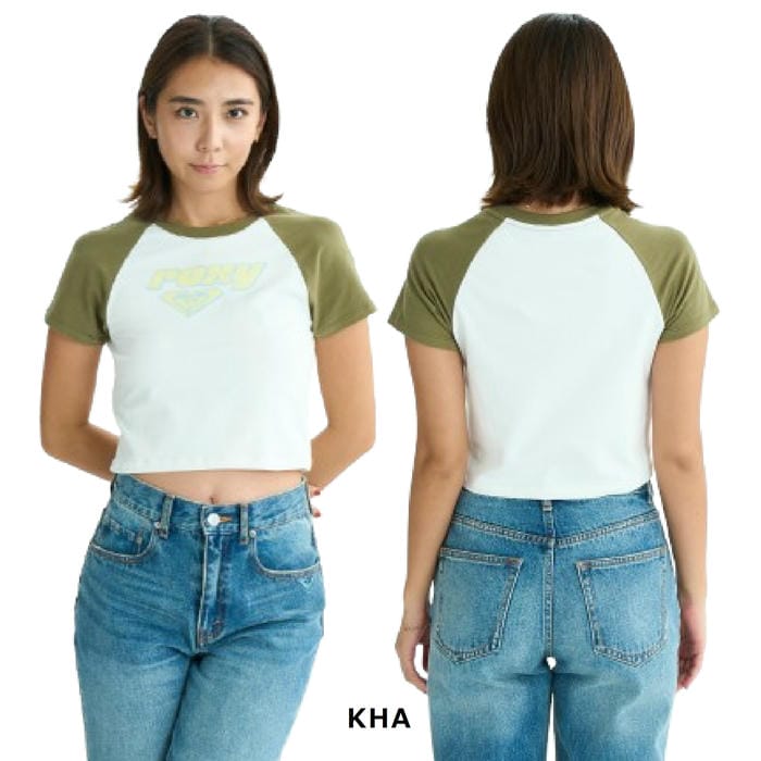 ROXY SUN OVER RST252041 Tシャツ 半袖 ラグランスリーブ ショート丈 スポーティー レトロ プリント ロゴ チビT へそだし BLU KHA NVY ロキシー 正規品