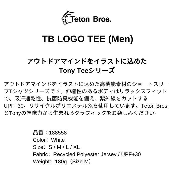 メーカー希望小売価格はメーカーカタログに基づいて掲載しています商品説明モデル名TETON BROSTB LOGO TEE (Men)定価:4900+(税)サイズS , M , L , XLカラーWhite概要アウトドアマインドをイラストに込めたTony Teeシリーズアウトドアマインドをイラストに込めた高機能素材のショートスリーブTシャツシリーズです。伸縮性のあるボディはリラックスフィットで、吸汗速乾性、抗菌防臭機能を備え、紫外線をカットするUPF+30。リサイクルポリエステル糸を使用しています。Teton Bros. とTonyの想像力から生まれるグラフィックをお楽しみください。※注意事項●返品について●お客様都合によるご注文後の返品・キャンセル・交換は一切受け付けておりませんので、予めご了承下さい。●商品画像について●撮影状況、PC状況により、色合いが若干異なる場合がありますので、ご了承の上ご購入ください。●商品欠品について●掲載されている全ての商品は実店舗・他のネットショッピングでも販売しております。ご注文を承り次第在庫を確保しますが、完売の際はご容赦下さい。 ●送料について●北海道・沖縄・離島等の場合、別途送料が必要となります。