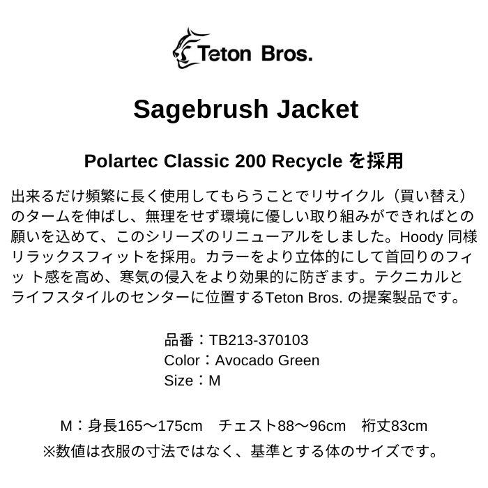 メーカー希望小売価格はメーカーカタログに基づいて掲載しています商品説明モデル名TETON BROSSagebrush Jacket定価:15000+(税)サイズMカラーAvocado Green概要Polartec Classic 200 Recycle を採用出来るだけ頻繁に長く使用してもらうことでリサイクル(買い替え)のタームを伸ばし、無理をせず環境に優しい取り組みができればとの願いを込めて、このシリーズのリニューアルをしました。Hoody 同様リラックスフィットを採用。カラーをより立体的にして首回りのフィット感を高め、寒気の侵入をより効果的に防ぎます。テクニカルとライフスタイルのセンターに位置するTeton Bros.の提案製品です。※注意事項●返品について●お客様都合によるご注文後の返品・キャンセル・交換は一切受け付けておりませんので、予めご了承下さい。●商品画像について●撮影状況、PC状況により、色合いが若干異なる場合がありますので、ご了承の上ご購入ください。●商品欠品について●掲載されている全ての商品は実店舗・他のネットショッピングでも販売しております。ご注文を承り次第在庫を確保しますが、完売の際はご容赦下さい。 ●送料について●北海道・沖縄・離島等の場合、別途送料が必要となります。