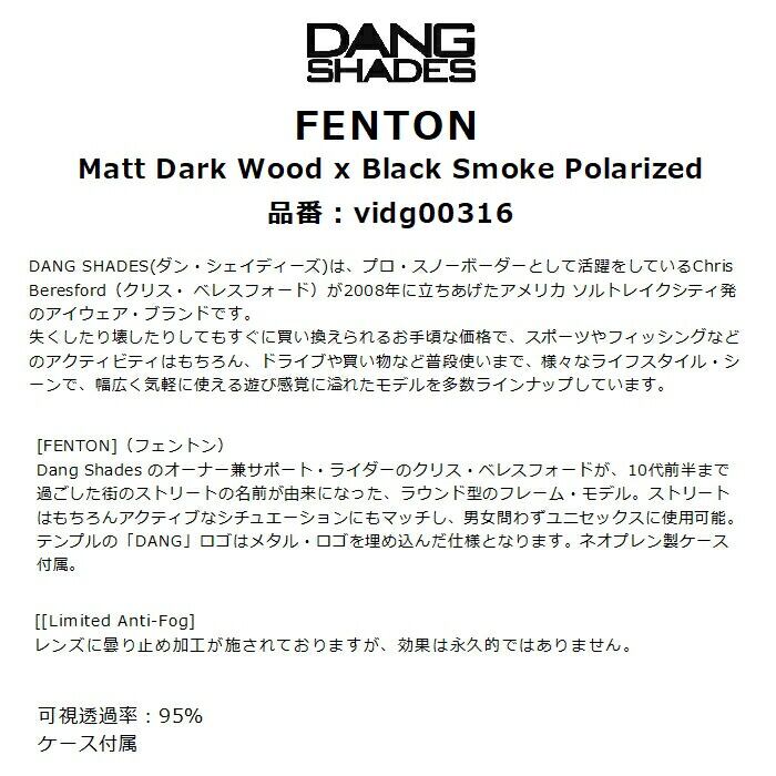 メーカー希望小売価格はメーカーカタログに基づいて掲載しています商品説明モデル名DANG SHADESFENTON定価:4000+(税)概要[FENTON](フェントン)Dang Shades のオーナー兼サポート・ライダーのクリス・ベレスフォードが、10代前半まで過ごした街のストリートの名前が由来になった、ラウンド型のフレーム・モデル。ストリートはもちろんアクティブなシチュエーションにもマッチし、男女問わずユニセックスに使用可能。テンプルの「DANG」ロゴはメタル・ロゴを埋め込んだ仕様となります。ネオプレン製ケース付属。[[Limited Anti-Fog] レンズに曇り止め加工が施されておりますが、効果は永久的ではありません。カラーフレーム:ブラック・ソフトレンズ:クリア / リミテッド・アンチフォグ可視光線透過率約95%※注意事項●返品について●お客様都合によるご注文後の返品・キャンセル・交換は一切受け付けておりませんので、予めご了承下さい。●商品画像について●撮影状況、PC状況により、色合いが若干異なる場合がありますので、ご了承の上ご購入ください。●商品欠品について●掲載されている全ての商品は実店舗・他のネットショッピングでも販売しております。ご注文を承り次第在庫を確保しますが、完売の際はご容赦下さい。 ●送料について●北海道・沖縄・離島等の場合、別途送料が必要となります。