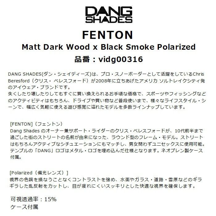 メーカー希望小売価格はメーカーカタログに基づいて掲載しています商品説明モデル名DANG SHADESFENTON定価:5000+(税)概要[FENTON](フェントン)Dang Shades のオーナー兼サポート・ライダーのクリス・ベレスフォードが、10代前半まで過ごした街のストリートの名前が由来になった、ラウンド型のフレーム・モデル。ストリートはもちろんアクティブなシチュエーションにもマッチし、男女問わずユニセックスに使用可能。テンプルの「DANG」ロゴはメタル・ロゴを埋め込んだ仕様となります。ネオプレン製ケース付属。[Polarized(偏光レンズ)]視界の色調を損なうことなくコントラストを強め、水面やガラス・道路・雪原などのギラギラした乱反射をカットし、目が疲れにくいスッキリとした快適な視界を確保します。カラーフレーム:ウッド・マットレンズ:ブラックスモーク / 偏光レンズ可視光線透過率約15%※注意事項●返品について●お客様都合によるご注文後の返品・キャンセル・交換は一切受け付けておりませんので、予めご了承下さい。●商品画像について●撮影状況、PC状況により、色合いが若干異なる場合がありますので、ご了承の上ご購入ください。●商品欠品について●掲載されている全ての商品は実店舗・他のネットショッピングでも販売しております。ご注文を承り次第在庫を確保しますが、完売の際はご容赦下さい。 ●送料について●北海道・沖縄・離島等の場合、別途送料が必要となります。