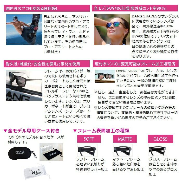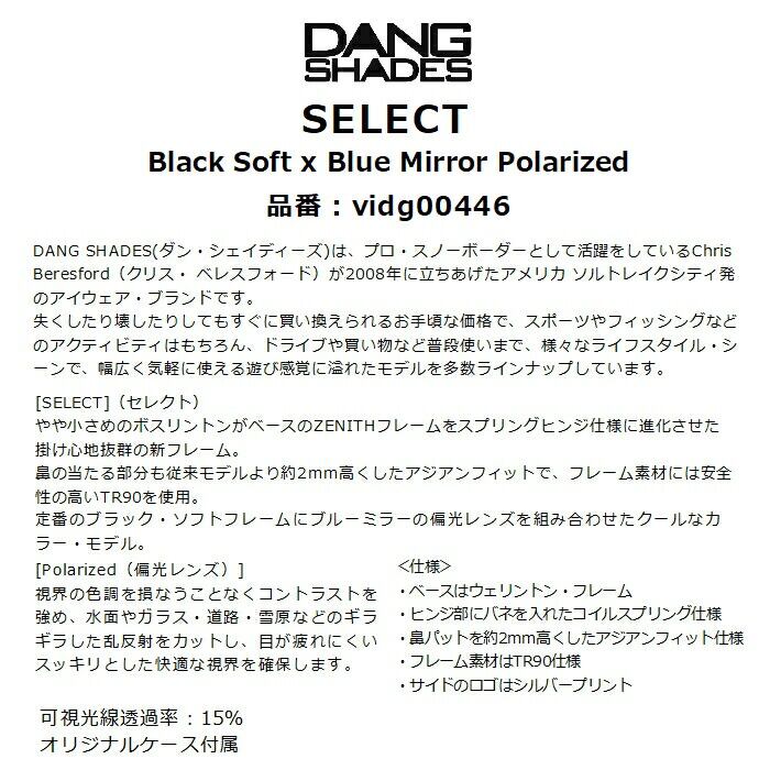 メーカー希望小売価格はメーカーカタログに基づいて掲載しています商品説明モデル名DANG SHADESSELECT定価:5450+(税)概要[SELECT](セレクト)やや小さめのボスリントンがベースのZENITHフレームをスプリングヒンジ仕様に進化させた掛け心地抜群の新フレーム。鼻の当たる部分も従来モデルより約2mm高くしたアジアンフィットで、フレーム素材には安全性の高いTR90を使用。定番のブラック・ソフトフレームにブルーミラーの偏光レンズを組み合わせたクールなカラー・モデル。[Polarized(偏光レンズ)]視界の色調を損なうことなくコントラストを強め、水面やガラス・道路・雪原などのギラギラした乱反射をカットし、目が疲れにくいスッキリとした快適な視界を確保します。カラーフレーム:ブラック・ソフトレンズ:ブルーミラー / 偏光レンズ可視光線透過率約15%※注意事項●返品について●お客様都合によるご注文後の返品・キャンセル・交換は一切受け付けておりませんので、予めご了承下さい。●商品画像について●撮影状況、PC状況により、色合いが若干異なる場合がありますので、ご了承の上ご購入ください。●商品欠品について●掲載されている全ての商品は実店舗・他のネットショッピングでも販売しております。ご注文を承り次第在庫を確保しますが、完売の際はご容赦下さい。 ●送料について●北海道・沖縄・離島等の場合、別途送料が必要となります。