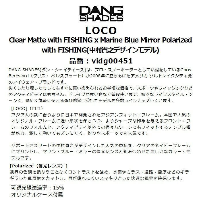 メーカー希望小売価格はメーカーカタログに基づいて掲載しています商品説明モデル名DANG SHADESLOCO定価:5000+(税)概要[LOCO](ロコ)アジア人の顔に合うように日本で開発されたアジアンフィット・フレーム。本国で人気のオリジナル・フレームに近い形状を保ちつつ、よりシャープな印象を与えるフロント・フレームのフォルムと、アクティビティ以外での様々なシーンでもフィットするテンプル幅が魅力。激しく動いてもズレにくく、釣りやスポーツでも人気です。サポートアスリートの中村貴之がデザインした人気の魚柄を、クリアのネイビーフレームにプリントし、マリン・ブルー・ミラーの偏光レンズと組み合わせた涼しげなカラー・モデルです。カラーフレーム:ネイビークリアマットレンズ:マリンブルーミラー / 偏光レンズ可視光線透過率約15%※注意事項●返品について●お客様都合によるご注文後の返品・キャンセル・交換は一切受け付けておりませんので、予めご了承下さい。●商品画像について●撮影状況、PC状況により、色合いが若干異なる場合がありますので、ご了承の上ご購入ください。●商品欠品について●掲載されている全ての商品は実店舗・他のネットショッピングでも販売しております。ご注文を承り次第在庫を確保しますが、完売の際はご容赦下さい。 ●送料について●北海道・沖縄・離島等の場合、別途送料が必要となります。
