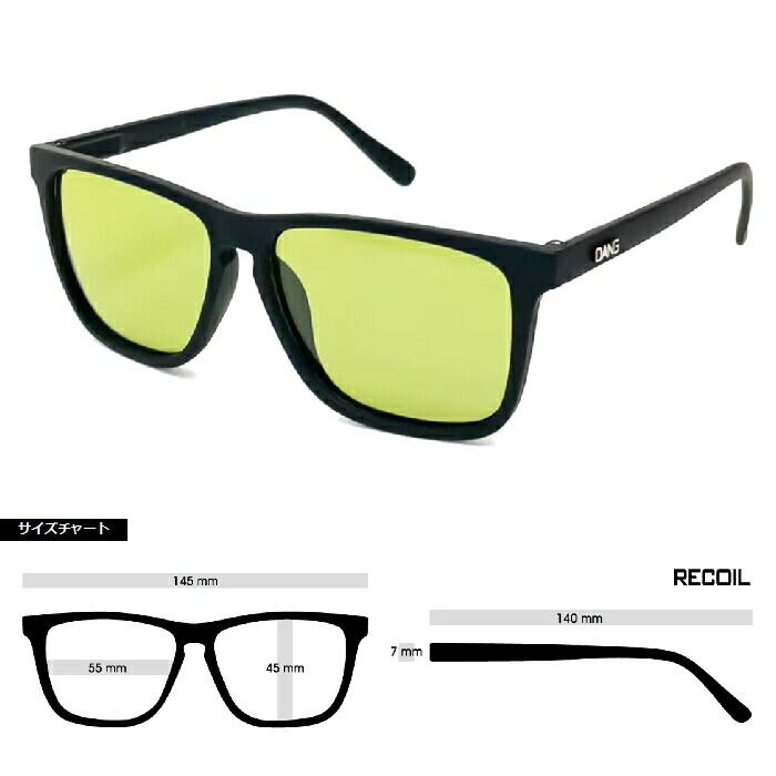 メーカー希望小売価格はメーカーカタログに基づいて掲載しています商品説明モデル名DANG SHADESRECOIL定価:6350+(税)概要[RECOIL](リコイル)スプリングヒンジ搭載で、テンプルが90度以上に開くため、どんなお顔にもフィットし、ノーストレスな掛け心地で快適にご使用いただけます。大きめのレンズとスッキリとしたフレームの絶妙なフォルムが特徴的で、男女を問わず使えるワンランク上のフレームモデル。ソリッドグリーンの偏光レンズは、朝・夕や悪天候時など、光量の少ないシーンで視界を明るくする効果があります。[Polarized(偏光レンズ)]視界の色調を損なうことなくコントラストを強め、水面やガラス・道路・雪原などのギラギラした乱反射をカットし、目が疲れにくいスッキリとした快適な視界を確保します。カラーフレーム:ブラック・ソフトレンズ:ソリッドグリーン / 偏光レンズ可視光線透過率約50%※注意事項●返品について●お客様都合によるご注文後の返品・キャンセル・交換は一切受け付けておりませんので、予めご了承下さい。●商品画像について●撮影状況、PC状況により、色合いが若干異なる場合がありますので、ご了承の上ご購入ください。●商品欠品について●掲載されている全ての商品は実店舗・他のネットショッピングでも販売しております。ご注文を承り次第在庫を確保しますが、完売の際はご容赦下さい。 ●送料について●北海道・沖縄・離島等の場合、別途送料が必要となります。