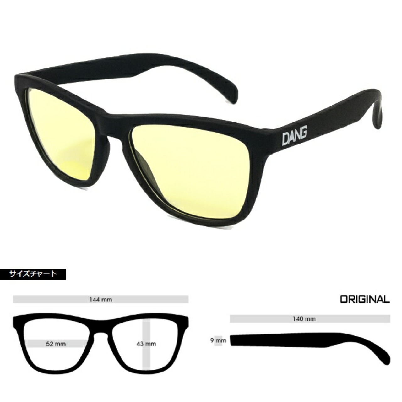メーカー希望小売価格はメーカーカタログに基づいて掲載しています商品説明モデル名DANG SHADESORIGINAL定価:5450+(税)概要[ORIGINAL](オリジナル)DANG SHADESがブランドをスタートした際にリリースしたルーツとなる不動の人気フレーム・シェイプ・モデル。定番のウェリントンのフレームをベースで、抜群のフィット感とカラーバリエーションで、ライディング時はもちろん、様々なライフスタイル・シーンに合わせたボーダレスなコーディネートが男女問わずユニセックスで利用可能。DANG SHADESが新たに提案する夜間用サングラス・モデル。レンズはJIS規格(日本工業規格)適合の日本製レンズを使用。対向車のヘッドライトなど「LEDライト(460nm)」の眩しさを抑えつつ、視界を良好に保ちます。光の少ないロー・ライトの環境下での視認性を高める為、遮光してしまう偏光レンズではなく、イエロー・カラーのハイコントラストレンズを採用しました。DANG SHADESのブランド・オリジナル・ネオプレンケースも付属になります。カラーフレーム:ブラック・ソフトレンズ:ライト・イエロー / ナイト・ハイコントラストレンズレンズ可視光線透過率:約84%紫外線99.9%以上カットブルー・ライト・カット約47%※注意事項●返品について●お客様都合によるご注文後の返品・キャンセル・交換は一切受け付けておりませんので、予めご了承下さい。●商品画像について●撮影状況、PC状況により、色合いが若干異なる場合がありますので、ご了承の上ご購入ください。●商品欠品について●掲載されている全ての商品は実店舗・他のネットショッピングでも販売しております。ご注文を承り次第在庫を確保しますが、完売の際はご容赦下さい。 ●送料について●北海道・沖縄・離島等の場合、別途送料が必要となります。