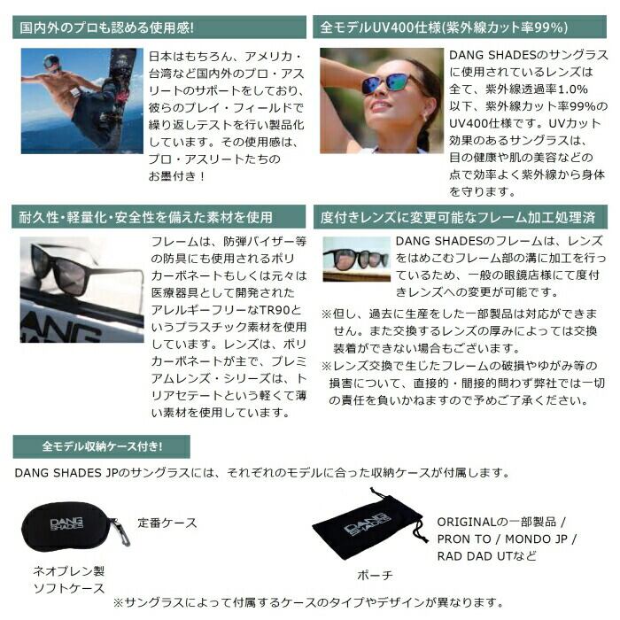 メーカー希望小売価格はメーカーカタログに基づいて掲載しています商品説明モデル名DANG SHADESFENTON定価:5000+(税)概要[FENTON]Dang Shades のオーナー兼サポート・ライダーのクリス・ベレスフォードが、10代前半まで過ごした街のストリートの名前が由来になった、ラウンド型のフレーム・モデル。ストリートはもちろんアクティブなシチュエーションにもマッチし、男女問わずユニセックスに使用可能。テンプルの「DANG」ロゴはメタル・ロゴを埋め込んだ仕様となります。過去に限定数のみでリリースをして人気のあった鼈甲柄のフレームに、ブラックス・スモークの偏光レンズの組み合わせたカラー・モデル。約16グラムという軽量さに加えて、アウトドアでもタウンユースでも、オールラウンドでマッチするデザイン。[Polarized(偏光レンズ)]視界の色調を損なうことなくコントラストを強め、雪原等からのギラギラした乱反射をカットし目が疲れにくく、すっきりとした快適な視界を確保するレンズ。ゲレンデにおけるライディング面の状況把握等で通常のレンズとは違った効果を発揮します。カラーフレーム:ブラック・ソフトレンズ:ローズミラー / 偏光レンズ(ミラー)可視光線透過率約15%※注意事項●返品について●お客様都合によるご注文後の返品・キャンセル・交換は一切受け付けておりませんので、予めご了承下さい。●商品画像について●撮影状況、PC状況により、色合いが若干異なる場合がありますので、ご了承の上ご購入ください。●商品欠品について●掲載されている全ての商品は実店舗・他のネットショッピングでも販売しております。ご注文を承り次第在庫を確保しますが、完売の際はご容赦下さい。 ●送料について●北海道・沖縄・離島等の場合、別途送料が必要となります。