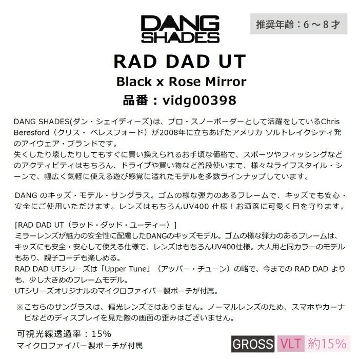 メーカー希望小売価格はメーカーカタログに基づいて掲載しています商品説明モデル名DANG SHADESRAD DAD UT定価:2200+(税)概要DANG のキッズ・モデル・サングラス。ゴムの様な弾力のあるフレームで、キッズでも安心・安全にご使用いただけます。レンズはもちろんUV400 仕様!お洒落に可愛く目を守ります。[RAD DAD UT(ラッド・ダッド・ユーティー)]ミラーレンズが魅力の安全性に配慮したDANGのキッズモデル。ゴムの様な弾力のあるフレームは、キッズにも安全・安心して使える仕様で、レンズはもちろんUV400仕様。大人用と同カラーのモデルもあり、親子コーデも楽しめる。RAD DAD UTシリーズは「Upper Tune」(アッパー・チューン)の略で、今までの RAD DAD よりも、少し大きめのフレームモデル。UTシリーズオリジナルのマイクロファイバー製ポーチが付属。※こちらのサングラスは、偏光レンズではありません。ノーマルレンズのため、スマホやカーナビなどのディスプレイを見た際の画面の歪みはございません。カラーフレーム:ブラックレンズ:ローズミラー / ノーマルレンズ(ミラー)可視光線透過率約15%※注意事項●返品について●お客様都合によるご注文後の返品・キャンセル・交換は一切受け付けておりませんので、予めご了承下さい。●商品画像について●撮影状況、PC状況により、色合いが若干異なる場合がありますので、ご了承の上ご購入ください。●商品欠品について●掲載されている全ての商品は実店舗・他のネットショッピングでも販売しております。ご注文を承り次第在庫を確保しますが、完売の際はご容赦下さい。 ●送料について●北海道・沖縄・離島等の場合、別途送料が必要となります。