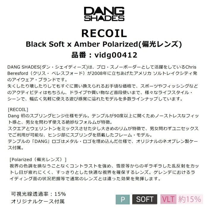 メーカー希望小売価格はメーカーカタログに基づいて掲載しています商品説明モデル名DANG SHADESRECOIL定価:6350+(税)概要[RECOIL]Dang 初のスプリングヒンジ仕様モデル。テンプルが90度以上に開くためノーストレスなフィット感と、男女を問わず使える絶妙なフォルムが特徴。スクエアとウェリントンをミックスさせた少し大きめのリムが特徴で、男女問わずユニセックスでご利用が可能な、ヒンジ部にスプリングを搭載したフレーム・モデル。テンプルの「DANG」ロゴはメタル・ロゴを埋め込んだ仕様で、オリジナルのネオプレン製ケース付属。[Polarized(偏光レンズ)]視界の色調を損なうことなくコントラストを強め、雪原等からのギラギラした乱反射をカットし目が疲れにくく、すっきりとした快適な視界を確保するレンズ。ゲレンデにおけるライディング面の状況把握等で通常のレンズとは違った効果を発揮します。カラーフレーム:ブラック・ソフトレンズ:アンバー / 偏光レンズ可視光線透過率約15%※注意事項●返品について●お客様都合によるご注文後の返品・キャンセル・交換は一切受け付けておりませんので、予めご了承下さい。●商品画像について●撮影状況、PC状況により、色合いが若干異なる場合がありますので、ご了承の上ご購入ください。●商品欠品について●掲載されている全ての商品は実店舗・他のネットショッピングでも販売しております。ご注文を承り次第在庫を確保しますが、完売の際はご容赦下さい。 ●送料について●北海道・沖縄・離島等の場合、別途送料が必要となります。