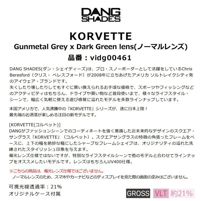 メーカー希望小売価格はメーカーカタログに基づいて掲載しています商品説明モデル名DANG SHADESKORVETTE定価:4000+(税)概要本国アメリカで、人気沸騰中の「KORVETTE」シリーズが、遂に日本上陸!最先端のお洒落が楽しめる注目の新モデルです。[KORVETTE(コルベット)] DANGがファッションシーンでのコーディネートを強く意識した近未来的なデザインのスクエア・サングラス「KORVETTE」(コルベット)。スクエアサングラスの特徴の角張ったフレームをベースに、上下の幅を絶妙な幅にしたシャープなフレームシェイプは、オリジナリティの溢れた洗練されたスタイリッシュ印象を与えます。偏光レンズ仕様ではないですが、特別なライフスタイルシーンで他のモデルと合わせてラインナップをオススメしたいモデルです。レンズはもちろんUV400仕様。※こちらの商品は、偏光レンズ仕様ではございません。ノーマルレンズのため、スマホやカーナビなどのディスプレイを見た際の画面の歪みはございません。カラーフレーム:ガンメタルグレーレンズ:ダークグリーン / ノーマルレンズ可視光線透過率約21%※注意事項●返品について●お客様都合によるご注文後の返品・キャンセル・交換は一切受け付けておりませんので、予めご了承下さい。●商品画像について●撮影状況、PC状況により、色合いが若干異なる場合がありますので、ご了承の上ご購入ください。●商品欠品について●掲載されている全ての商品は実店舗・他のネットショッピングでも販売しております。ご注文を承り次第在庫を確保しますが、完売の際はご容赦下さい。 ●送料について●北海道・沖縄・離島等の場合、別途送料が必要となります。