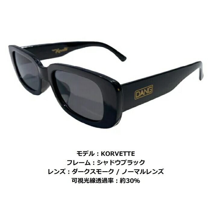 メーカー希望小売価格はメーカーカタログに基づいて掲載しています商品説明モデル名DANG SHADESKORVETTE定価:4000+(税)概要本国アメリカで、人気沸騰中の「KORVETTE」シリーズが、遂に日本上陸!最先端のお洒落が楽しめる注目の新モデルです。[KORVETTE(コルベット)] DANGがファッションシーンでのコーディネートを強く意識した近未来的なデザインのスクエア・サングラス「KORVETTE」(コルベット)。スクエアサングラスの特徴の角張ったフレームをベースに、上下の幅を絶妙な幅にしたシャープなフレームシェイプは、オリジナリティの溢れた洗練されたスタイリッシュ印象を与えます。偏光レンズ仕様ではないですが、特別なライフスタイルシーンで他のモデルと合わせてラインナップをオススメしたいモデルです。レンズはもちろんUV400仕様。※こちらの商品は、偏光レンズ仕様ではございません。ノーマルレンズのため、スマホやカーナビなどのディスプレイを見た際の画面の歪みはございません。カラーフレーム:シャドウブラックレンズ:ダークスモーク / ノーマルレンズ可視光線透過率約14%※注意事項●返品について●お客様都合によるご注文後の返品・キャンセル・交換は一切受け付けておりませんので、予めご了承下さい。●商品画像について●撮影状況、PC状況により、色合いが若干異なる場合がありますので、ご了承の上ご購入ください。●商品欠品について●掲載されている全ての商品は実店舗・他のネットショッピングでも販売しております。ご注文を承り次第在庫を確保しますが、完売の際はご容赦下さい。 ●送料について●北海道・沖縄・離島等の場合、別途送料が必要となります。