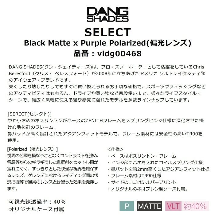 DANG SHADES ダンシェイディーズ SELECT vidg00468 セレクト 偏光レンズ ブラック・マット パープル ZENITHフレーム TR90 ケース付属 ロゴ サングラス 正規品