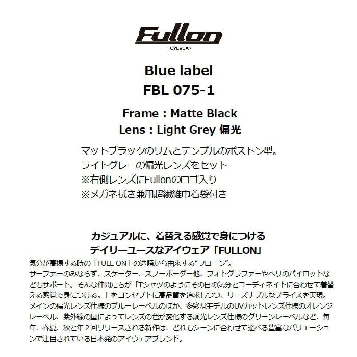 FULLON フローン FBL 075-1 MatteBlack LightGrey偏光レンズ ボストン型 メガネ拭き兼用超繊維巾着袋付属 ロゴ入り右側レンズ つや消し サングラス 正規品