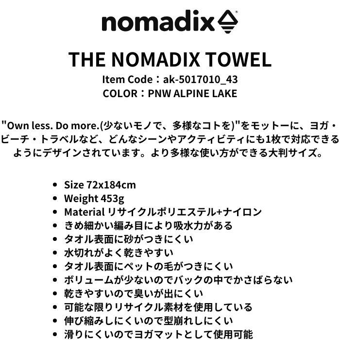 メーカー希望小売価格はメーカーカタログに基づいて掲載しています商品説明モデル名NOMADIXTHE NOMADIX TOWEL定価:6000+(税)サイズ72x184cmカラーPNW/ALPINE詳細"Own less. Do more.(少ないモノで、多様なコトを)"をモットーに、ヨガ・ビーチ・トラベルなど、どんなシーンやアクティビティにも1枚で対応できるようにデザインされています。より多様な使い方ができる大判サイズ。SPEC・Size 72x184cm・Weight 453g・Material リサイクルポリエステル+ナイロン・きめ細かい編み目により吸水力がある・タオル表面に砂がつきにくい・水切れがよく乾きやすい・タオル表面にペットの毛がつきにくい・ボリュームが少ないのでバックの中でかさばらない・乾きやすいので臭いが出にくい・可能な限りリサイクル素材を使用している・伸び縮みしにくいので型崩れしにくい・滑りにくいのでヨガマットとして使用可能※注意事項●返品について●お客様都合によるご注文後の返品・キャンセル・交換は一切受け付けておりませんので、予めご了承下さい。●商品画像について●撮影状況、PC状況により、色合いが若干異なる場合がありますので、ご了承の上ご購入ください。●商品欠品について●掲載されている全ての商品は実店舗・他のネットショッピングでも販売しております。ご注文を承り次第在庫を確保しますが、完売の際はご容赦下さい。 ●送料について●北海道・沖縄・離島等の場合、別途送料が必要となります。