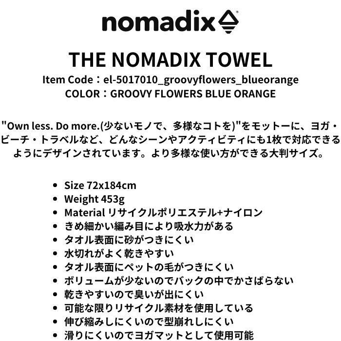 メーカー希望小売価格はメーカーカタログに基づいて掲載しています商品説明モデル名NOMADIXTHE NOMADIX TOWEL定価:5400+(税)サイズ72x184cmカラーGROOVYFLWR BLUEOR詳細"Own less. Do more.(少ないモノで、多様なコトを)"をモットーに、ヨガ・ビーチ・トラベルなど、どんなシーンやアクティビティにも1枚で対応できるようにデザインされています。より多様な使い方ができる大判サイズ。SPEC・Size 72x184cm・Weight 453g・Material リサイクルポリエステル+ナイロン・きめ細かい編み目により吸水力がある・タオル表面に砂がつきにくい・水切れがよく乾きやすい・タオル表面にペットの毛がつきにくい・ボリュームが少ないのでバックの中でかさばらない・乾きやすいので臭いが出にくい・可能な限りリサイクル素材を使用している・伸び縮みしにくいので型崩れしにくい・滑りにくいのでヨガマットとして使用可能※注意事項●返品について●お客様都合によるご注文後の返品・キャンセル・交換は一切受け付けておりませんので、予めご了承下さい。●商品画像について●撮影状況、PC状況により、色合いが若干異なる場合がありますので、ご了承の上ご購入ください。●商品欠品について●掲載されている全ての商品は実店舗・他のネットショッピングでも販売しております。ご注文を承り次第在庫を確保しますが、完売の際はご容赦下さい。 ●送料について●北海道・沖縄・離島等の場合、別途送料が必要となります。