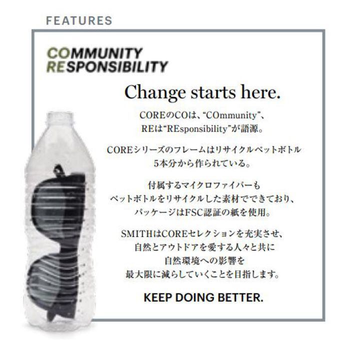 メーカー希望小売価格はメーカーカタログに基づいて掲載しています商品説明モデル名SMITHLowdown2 CORE定価:23000+(税)詳細SMITH COmmunity REsponsibility InitiativeCOREシリーズはEarth Day 50周年に合わせて自然環境を考慮して作られた最新シリーズ。SMITHアイコンモデルのローダウン2をCORE素材で仕上げた。アウトドアを愛するブランドとして自然環境に与える影響を最大限に減らしたい。COREのCOは、“COmmunity”、REは“REsponsibility”が語源。COREシリーズのフレームはリサイクルペットボトル5本分から作られている。付属するマイクロファイバーもペットボトルをリサイクルした素材でできており、パッケージはFSC認証の紙を使用。SMITHはCOREセレクションを充実させ、自然とアウトドアを愛する人々と共に自然環境への影響を最大限に減らしていくことを目指します。Lowdown 2初期のローダウンに比べフレーム自体の厚みを抑え、レンズカーブを4ベースに変更。スタイルは70年代のウエリントンをSMITH 流に味付け。フィット感を抜群に向上。時代のトレンドを洗練されたシンプルさでスタイリッシュに演出。フレームカラーMatte BlackレンズカラーPolarized Gray(偏光レンズ)※注意事項●返品について●お客様都合によるご注文後の返品・キャンセル・交換は一切受け付けておりませんので、予めご了承下さい。●商品画像について●撮影状況、PC状況により、色合いが若干異なる場合がありますので、ご了承の上ご購入ください。●商品欠品について●掲載されている全ての商品は実店舗・他のネットショッピングでも販売しております。ご注文を承り次第在庫を確保しますが、完売の際はご容赦下さい。 ●送料について●北海道・沖縄・離島等の場合、別途送料が必要となります。