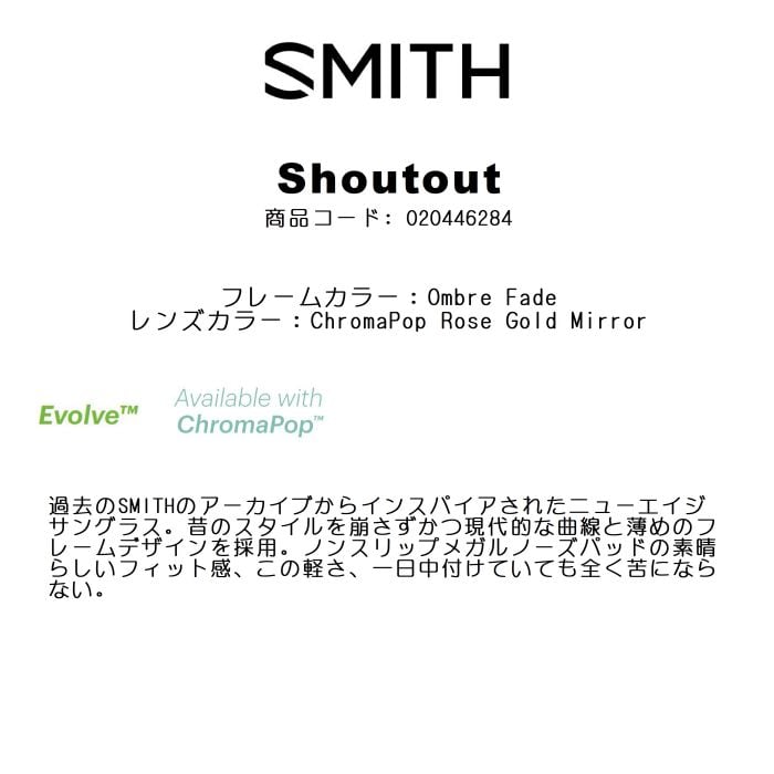 メーカー希望小売価格はメーカーカタログに基づいて掲載しています商品説明モデル名SMITHShoutout定価:18500+(税)詳細過去のSMITHのアーカイブからインスパイアされたニューエイジサングラス。昔のスタイルを崩さずかつ現代的な曲線と薄めのフレームデザインを採用。ノンスリップメガルノーズパッドの素晴らしいフィット感、この軽さ、一日中付けていても全く苦にならない。フレームカラーOmbre FadeレンズカラーChromaPop Rose Gold Mirror※注意事項●返品について●お客様都合によるご注文後の返品・キャンセル・交換は一切受け付けておりませんので、予めご了承下さい。●商品画像について●撮影状況、PC状況により、色合いが若干異なる場合がありますので、ご了承の上ご購入ください。●商品欠品について●掲載されている全ての商品は実店舗・他のネットショッピングでも販売しております。ご注文を承り次第在庫を確保しますが、完売の際はご容赦下さい。 ●送料について●北海道・沖縄・離島等の場合、別途送料が必要となります。