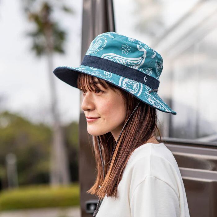 大人の遊び心をくすぐる落ち着いた色合いと、大き目のペイズリー柄はコーディネートのアクセントに、女性だけでなく、男性でも被りやすいデザインはアウトドアフィールドだけでなく、旅行でも使いやすいデザイン。