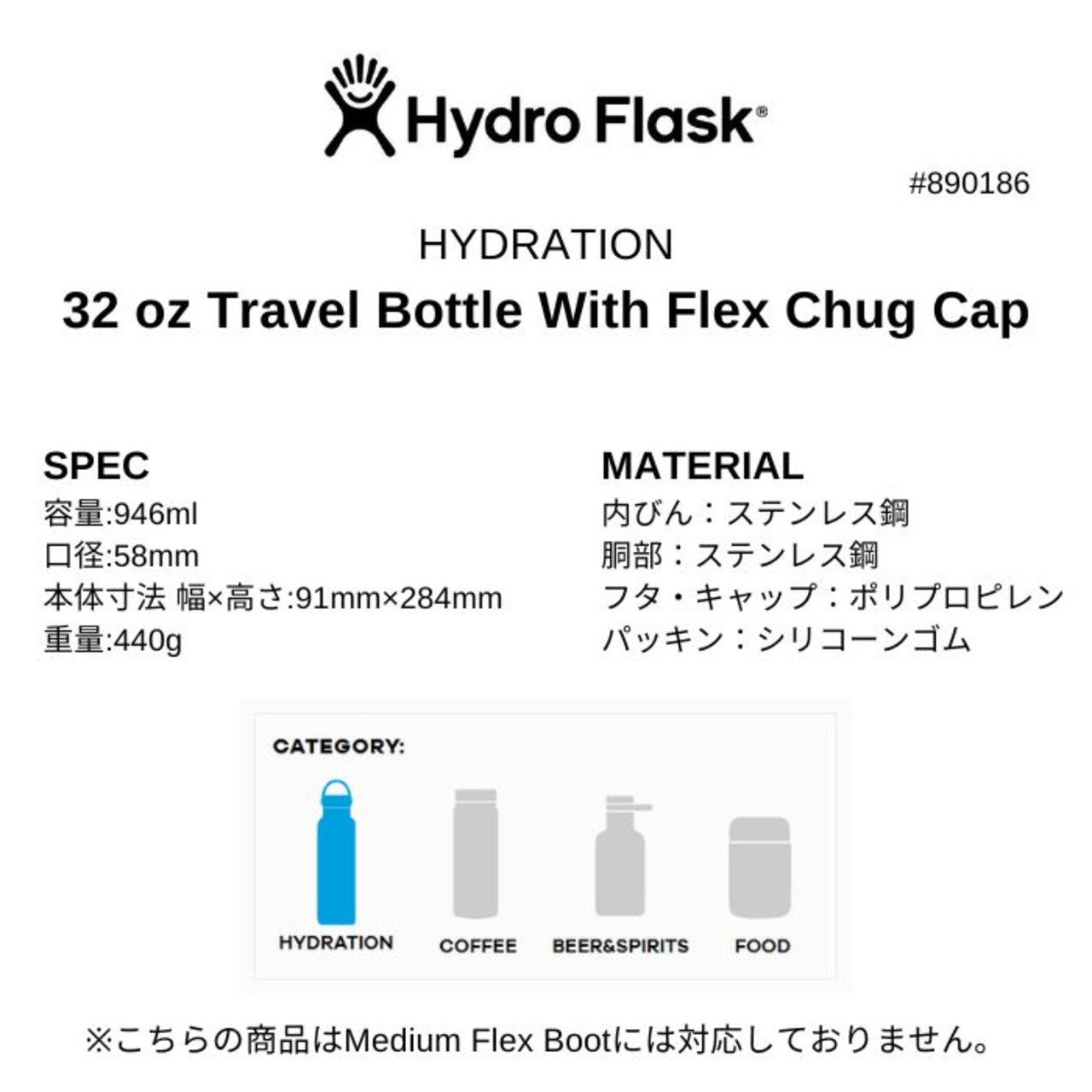 メーカー希望小売価格はメーカーカタログに基づいて掲載しています商品説明モデル名HydroFlask32 oz Travel Bottle With Flex Chug Cap定価:6300+(税)サイズ32ozカラーBlack詳細【SPEC】容量:946ml口径:58mm本体寸法 幅×高さ:91mm×284mm重量:440g【MATERIAL】内びん:ステンレス鋼胴部:ステンレス鋼フタ・キャップ:ポリプロピレンパッキン:シリコーンゴム※こちらの商品はMedium Flex Bootには対応しておりません。※注意事項●返品について●お客様都合によるご注文後の返品・キャンセル・交換は一切受け付けておりませんので、予めご了承下さい。●商品画像について●撮影状況、PC状況により、色合いが若干異なる場合がありますので、ご了承の上ご購入ください。●商品欠品について●掲載されている全ての商品は実店舗・他のネットショッピングでも販売しております。ご注文を承り次第在庫を確保しますが、完売の際はご容赦下さい。 ●送料について●北海道・沖縄・離島等の場合、別途送料が必要となります。