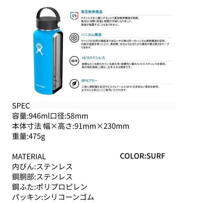 メーカー希望小売価格はメーカーカタログに基づいて掲載しています商品説明モデル名hydroflask32 oz Wide Mouth定価:6300+(税)カラーsurfサイズ32oz概要SPEC容量:946ml口径:58mm本体寸法 幅×高さ:91mm×230mm重量:475gMATERIAL内びん:ステンレス鋼胴部:ステンレス鋼ふた:ポリプロピレンパッキン:シリコーンゴム詳細※注意事項●返品について●お客様都合によるご注文後の返品・キャンセル・交換は一切受け付けておりませんので、予めご了承下さい。●商品画像について●撮影状況、PC状況により、色合いが若干異なる場合がありますので、ご了承の上ご購入ください。●商品欠品について●掲載されている全ての商品は実店舗・他のネットショッピングでも販売しております。ご注文を承り次第在庫を確保しますが、完売の際はご容赦下さい。 ●送料について●北海道・沖縄・離島等の場合、別途送料が必要となります。