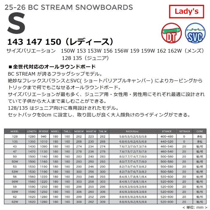 25-26 BC STREAM S ディレクショナルツイン ショートバリアブルキャンバー オールラウンド ビーシーストリーム エス レディース 国産 スノーボード 板 正規品