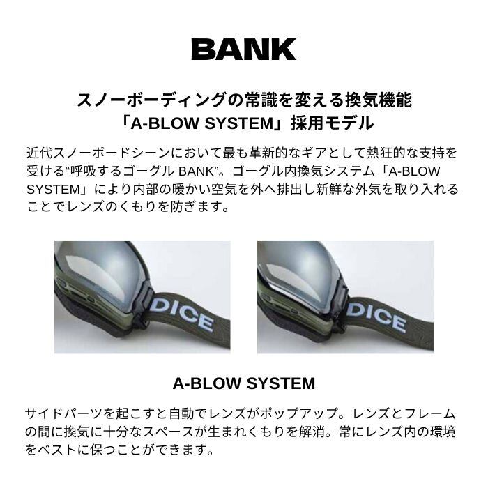 メーカー希望小売価格はメーカーカタログに基づいて掲載しています商品説明モデル名DICEBANK定価:33000+(税)モデルBANKカラーMBK概要フォトクロミック・テクノロジー(調光)を搭載したレンズ。ウルトラレンズの特長である「凹凸が見やすい」機能はそのままに、降雪時や曇天時〜晴天時までのあらゆる環境でレンズの明るさを自動的に調整する全天候レンズ。詳細スノーボーディングの常識を変える換気機能「A-BLOW SYSTEM」採用モデル近代スノーボードシーンにおいて最も革新的なギアとして熱狂的な支持を受ける“呼吸するゴーグルBANK”。ゴーグル内換気システム「A-BLOW SYSTEM」により内部の暖かい空気を外へ排出し新鮮な外気を取り入れることでレンズのくもりを防ぎます。【A-BLOW SYSTEM】サイドパーツを起こすと自動でレンズがポップアップ。レンズとフレームの間に換気に十分なスペースが生まれくもりを解消。常にレンズ内の環境をベストに保つことができます。※注意事項●返品について●お客様都合によるご注文後の返品・キャンセル・交換は一切受け付けておりませんので、予めご了承下さい。●商品画像について●撮影状況、PC状況により、色合いが若干異なる場合がありますので、ご了承の上ご購入ください。●商品欠品について●掲載されている全ての商品は実店舗・他のネットショッピングでも販売しております。ご注文を承り次第在庫を確保しますが、完売の際はご容赦下さい。 ●送料について●北海道・沖縄・離島等の場合、別途送料が必要となります。