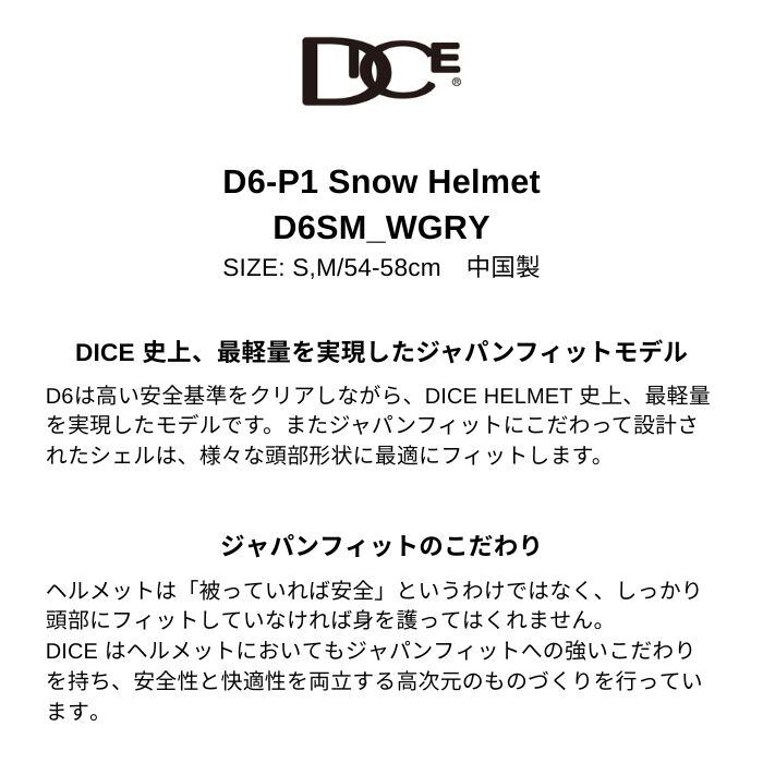 メーカー希望小売価格はメーカーカタログに基づいて掲載しています商品説明モデル名DICED6-P1定価:15000+(税)サイズSMカラーWGRY概要DICE 史上、最軽量を実現したジャパンフィットモデルD6は高い安全基準をクリアしながら、DICE HELMET 史上、最軽量を実現したモデルです。またジャパンフィットにこだわって設計されたシェルは、様々な頭部形状に最適にフィットします。詳細【FIDLOCK SNAP】磁石式ファスナーによって左右のバックルを近づけると自動的にロックするため、グローブを装着したままでも片手で簡単に操作することができます。※注意事項●返品について●お客様都合によるご注文後の返品・キャンセル・交換は一切受け付けておりませんので、予めご了承下さい。●商品画像について●撮影状況、PC状況により、色合いが若干異なる場合がありますので、ご了承の上ご購入ください。●商品欠品について●掲載されている全ての商品は実店舗・他のネットショッピングでも販売しております。ご注文を承り次第在庫を確保しますが、完売の際はご容赦下さい。 ●送料について●北海道・沖縄・離島等の場合、別途送料が必要となります。