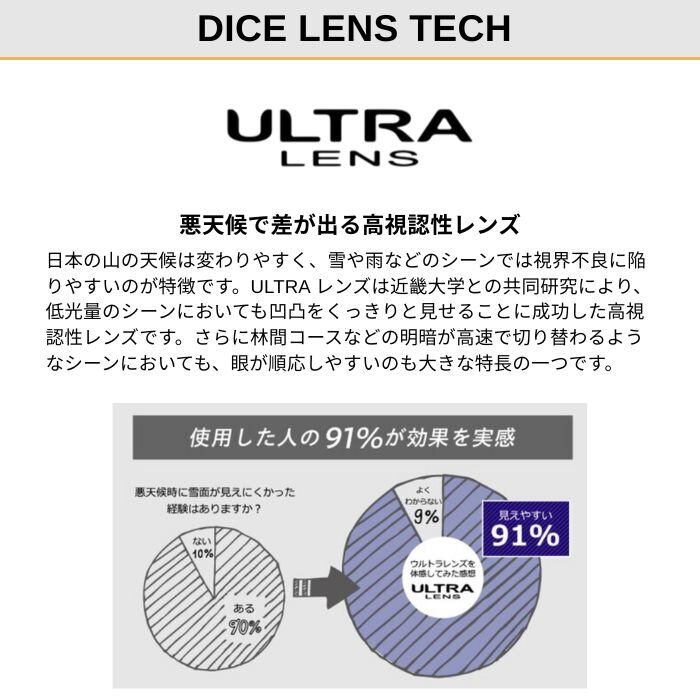 DICE の代名詞となったゴーグル内換気システム「A-BLOW SYSTEM」を採用した平面レンズモデル。圧倒的な視野の広さと日本人に最適な抜群のフィット感で、今までに経験したことのない新しいゴーグル体験を提供します。