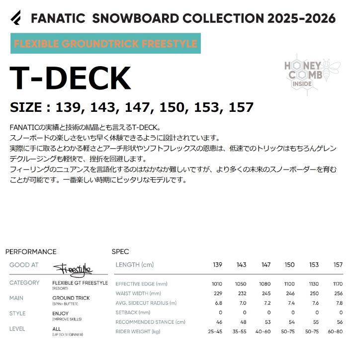25-26 FANATIC T-DECK 139/143/147/150/153/157 Vダブルキャンバー ツインチップ グラトリ フリースタイル ファナティック ティーデッキ スノーボード 板 正規品