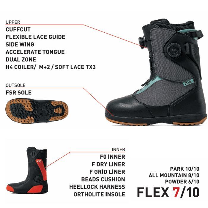 メーカー希望小売価格はメーカーカタログに基づいて掲載しています商品説明モデル名FLUXTB-BOA定価:57000+(税)サイズ23 , 23.5 , 24 , 24.5 , 25 , 25.5 , 26 , 26.5 , 27 , 27.5 , 28 , 28.5 , 29 , 29.5 , 30カラーBLACKGRAY詳細ビッグマウンテンからパークまで、滑りにあわせてタンのフレックス変更可能。ダブルBOAによる締め分けに加え、かかと浮き防止とビーズクッションの優れたフィット感が標準装備。アウターはバインディングとのマッチングを考慮したデザイン。ハイバックとの隙間を埋めるSIDEウィングでより繊細な動きに対応。甲に優しくフィットするFLEXIBLE LACE GUIDEが足元をやさしく、かつしっかりホールドします。※注意事項●返品について●お客様都合によるご注文後の返品・キャンセル・交換は一切受け付けておりませんので、予めご了承下さい。●商品画像について●撮影状況、PC状況により、色合いが若干異なる場合がありますので、ご了承の上ご購入ください。●商品欠品について●掲載されている全ての商品は実店舗・他のネットショッピングでも販売しております。ご注文を承り次第在庫を確保しますが、完売の際はご容赦下さい。 ●送料について●北海道・沖縄・離島等の場合、別途送料が必要となります。