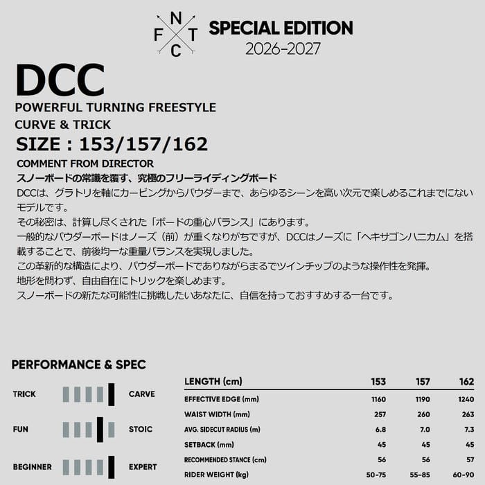 定価:85000+(税)サイズ153 , 157 , 162モデルDCC商品説明「スノーボード業界で唯一無二の革新的なモデル!」