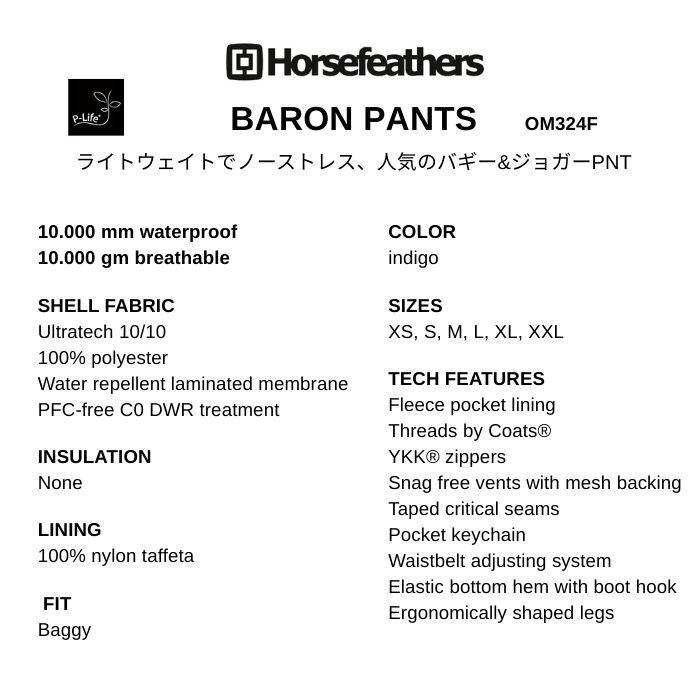 メーカー希望小売価格はメーカーカタログに基づいて掲載しています商品説明モデル名HorsefeathersBARON PANTS定価:26000+(税)サイズXS , S , M , L , XL , XXLカラーindigo概要ライトウェイトでノーストレス、人気のバギー&ジョガーPNT詳細10.000 mm waterproof10.000 gm breathable【SHELL FABRIC】Ultratech 10/10100% polyesterWater repellent laminated membranePFC-free C0 DWR treatment【INSULATION】None【LINING】100% nylon taffeta【FIT】Baggy【TECH FEATURES】Fleece pocket liningThreads by CoatsYKK zippersSnag free vents with mesh backingTaped critical seamsPocket keychainWaistbelt adjusting system※注意事項●返品について●お客様都合によるご注文後の返品・キャンセル・交換は一切受け付けておりませんので、予めご了承下さい。●商品画像について●撮影状況、PC状況により、色合いが若干異なる場合がありますので、ご了承の上ご購入ください。●商品欠品について●掲載されている全ての商品は実店舗・他のネットショッピングでも販売しております。ご注文を承り次第在庫を確保しますが、完売の際はご容赦下さい。 ●送料について●北海道・沖縄・離島等の場合、別途送料が必要となります。