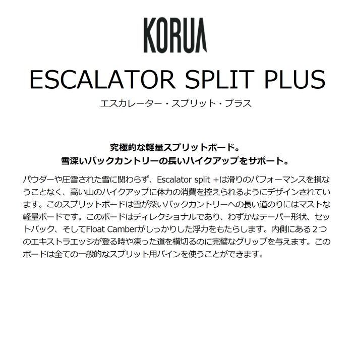 メーカー希望小売価格はメーカーカタログに基づいて掲載しています商品説明モデル名KORUAESCALATOR SPLIT PLUS定価:140000+(税)サイズ152 , 157 , 162モデルESCALATOR_SPLIT_PLUS商品説明パウダーや圧雪された雪に関わらず、Escalator split +は滑りのパフォーマンスを損なうことなく、高い山のハイクアップに体力の消費を控えられるようにデザインされています。このスプリットボードは雪が深いバックカントリーへの長い道のりにはマストな軽量ボードです。このボードはディレクショナルであり、わずかなテーパー形状、セットバック、そしてFloat Camberがしっかりした浮力をもたらします。内側にある2つのエキストラエッジが登る時や凍った道を横切るのに完璧なグリップを与えます。このボードは全ての一般的なスプリット用バインを使うことができます。購入特典・プレチューン/WAX FUTUREサービス■プレチューンとは?NEW BOARDのエッジ角の変更、エッジの立て直し調整、ベースWAXを行い、BOARDの性能を100%引き出すためのチューニングです※注意事項●返品について●お客様都合によるご注文後の返品・キャンセル・交換は一切受け付けておりませんので、予めご了承下さい。●商品画像について●撮影状況、PC状況により、色合いが若干異なる場合がありますので、ご了承の上ご購入ください。●商品欠品について●掲載されている全ての商品は実店舗・他のネットショッピングでも販売しております。ご注文を承り次第在庫を確保しますが、完売の際はご容赦下さい。 ●送料について●北海道・沖縄・離島等の場合、別途送料が必要となります。