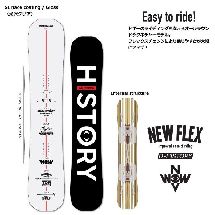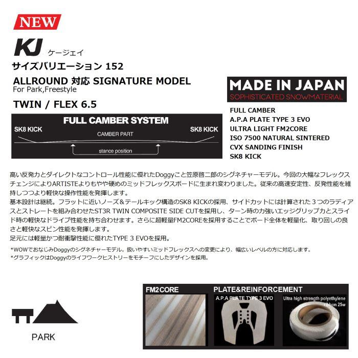 メーカー希望小売価格はメーカーカタログに基づいて掲載しています商品説明モデル名NOVEMBER SNOWMATERIALKJ定価:102000+(税)サイズ152モデルKJ商品説明高い反発力とダイレクトなコントロール性能に優れたDoggyこと笠原啓二郎のシグネチャーモデル。今回の大幅なフレックスチェンジによりARTISTEよりもやや硬めのミッドフレックスボードに生まれ変わりました。従来の高速安定性、反発性能を維持しつつより軽快な操作性能を発揮します。基本設計は継続。フラットに近いノーズ&テールキック構造のSK8 KICKの採用、サイドカットには計算された3つのラディアスとストレートを組み合わせたST3R TWIN COMPOSITE SIDE CUTを採用し、ターン時の力強いエッジグリップ力とスライド時の軽快なドライブ性能を持ち合わせます。さらに超軽量FM2COREを採用することでボード全体を軽量化、取り回しの良さと軽快なスピン性能を発揮します。足元には軽量かつ耐衝撃性能に優れたTYPE 3 EVOを採用。*WOWでおなじみDoggyのシグネチャーモデル。扱いやすいミッドフレックスへの変更により、幅広いレベルの方に対応します。*グラフィックはDoggyのライフワークヒストリーをモチーフにしたデザインを採用。形状フルキャンバー選べる 特典・プレチューン/WAX FUTUREサービス・オリジナルニットソールカバー・デッキシート・ショートビス(15.5mm)■プレチューンとは?NEW BOARDのエッジ角の変更、エッジの立て直し調整、ベースWAXを行い、BOARDの性能を100%引き出すためのチューニングです※注意事項●返品について●お客様都合によるご注文後の返品・キャンセル・交換は一切受け付けておりませんので、予めご了承下さい。●商品画像について●撮影状況、PC状況により、色合いが若干異なる場合がありますので、ご了承の上ご購入ください。●商品欠品について●掲載されている全ての商品は実店舗・他のネットショッピングでも販売しております。ご注文を承り次第在庫を確保しますが、完売の際はご容赦下さい。 ●送料について●北海道・沖縄・離島等の場合、別途送料が必要となります。