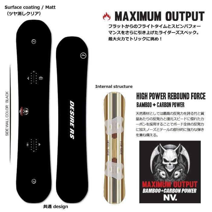 メーカー希望小売価格はメーカーカタログに基づいて掲載しています商品説明モデル名NOVEMBER SNOWMATERIALDESIRE_RS定価:106000+(税)サイズ147 , 150モデルDESIRE_RS商品説明強力なリバウンドフォースを備えたDESIRE RS。フラットでのノーリー性能とスピン性能に特化したハイポテンシャルモデルです。D ES I R E R Sでは芯材に竹(B amb o o)を超軽量FM2 COR Eに組み込んだFMB COREを採用。しなやかでありながら高反発、さらに超軽量なスイングウエイトのコンビネーションを可能にしました。またノーズ及びテールには反発力とレスポンスに優れた強力なW POWER CARBON RIBBON 50Wを採用することで弾力と回転力を向上させています。デザイアモールドはノーズ&テールのかかりの良さを向上させることで踏切時の回転力を強化。さらにトップとテールを3mmづつカットした全長サイズによってスイングウエイト軽減、ライディングの安定感はそのままにさらなる軽快な取り回しを提供します。またサイドカットには足元に特大の円弧を入れることで瞬時のエッジング力を高めるFLASH GRIP SIDECUTを採用。高回転スピンを可能にするための予備動作およびトリックの仕上げに必要なボードのズレを抑える強力なエッジグリップを生み出します。さらに足元には耐衝撃性能と操作性能を両立させた独自設計のDUCK PLATE(TYPE4)を装備。ダメージを軽減させるとともに足まわりのトーションを確保、高いコントロール性能を発揮します。形状フルキャンバー選べる 特典・プレチューン/WAX FUTUREサービス・オリジナルニットソールカバー・デッキシート・ショートビス(15.5mm)■プレチューンとは?NEW BOARDのエッジ角の変更、エッジの立て直し調整、ベースWAXを行い、BOARDの性能を100%引き出すためのチューニングです※注意事項●返品について●お客様都合によるご注文後の返品・キャンセル・交換は一切受け付けておりませんので、予めご了承下さい。●商品画像について●撮影状況、PC状況により、色合いが若干異なる場合がありますので、ご了承の上ご購入ください。●商品欠品について●掲載されている全ての商品は実店舗・他のネットショッピングでも販売しております。ご注文を承り次第在庫を確保しますが、完売の際はご容赦下さい。 ●送料について●北海道・沖縄・離島等の場合、別途送料が必要となります。