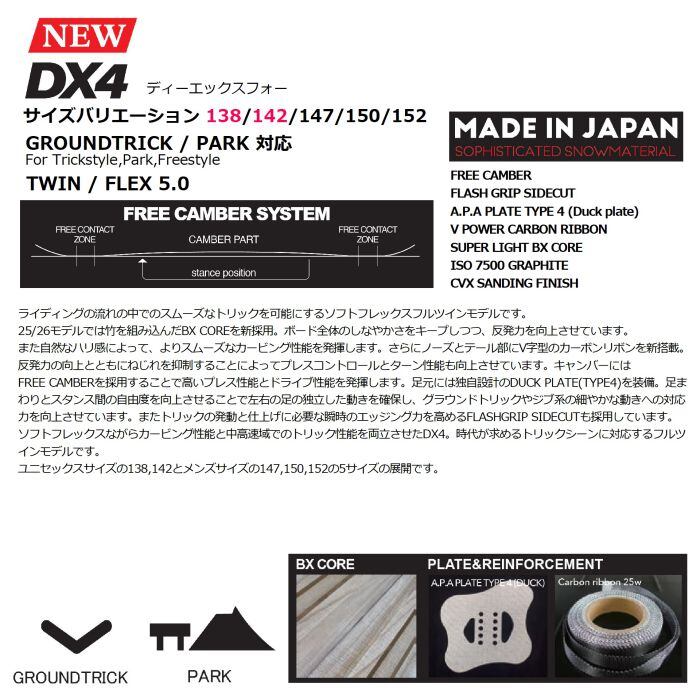 メーカー希望小売価格はメーカーカタログに基づいて掲載しています商品説明モデル名NOVEMBER SNOWMATERIALDX4定価:96000+(税)サイズ138 , 142 , 147 , 150 , 152モデルDX4商品説明ライディングの流れの中でのスムーズなトリックを可能にするソフトフレックスフルツインモデルです。25/26モデルでは竹を組み込んだBX COREを新採用。ボード全体のしなやかさをキープしつつ、反発力を向上させています。また自然なハリ感によって、よりスムーズなカービング性能を発揮します。さらにノーズとテール部にV字型のカーボンリボンを新搭載。反発力の向上とともにねじれを抑制することによってプレスコントロールとターン性能も向上させています。キャンバーにはFREE CAMBERを採用することで高いプレス性能とドライブ性能を発揮します。足元には独自設計のDUCK PLATE(TYPE4)を装備。足まわりとスタンス間の自由度を向上させることで左右の足の独立した動きを確保し、グラウンドトリックやジブ系の細やかな動きへの対応力を向上させています。またトリックの発動と仕上げに必要な瞬時のエッジング力を高めるFLASHGRIP SIDECUTも採用しています。ソフトフレックスながらカービング性能と中高速域でのトリック性能を両立させたDX4。時代が求めるトリックシーンに対応するフルツインモデルです。ユニセックスサイズの138,142とメンズサイズの147,150,152の5サイズの展開です。形状フリーキャンバー選べる 特典・プレチューン/WAX FUTUREサービス・オリジナルニットソールカバー・デッキシート・ショートビス(15.5mm)■プレチューンとは?NEW BOARDのエッジ角の変更、エッジの立て直し調整、ベースWAXを行い、BOARDの性能を100%引き出すためのチューニングです※注意事項●返品について●お客様都合によるご注文後の返品・キャンセル・交換は一切受け付けておりませんので、予めご了承下さい。●商品画像について●撮影状況、PC状況により、色合いが若干異なる場合がありますので、ご了承の上ご購入ください。●商品欠品について●掲載されている全ての商品は実店舗・他のネットショッピングでも販売しております。ご注文を承り次第在庫を確保しますが、完売の際はご容赦下さい。 ●送料について●北海道・沖縄・離島等の場合、別途送料が必要となります。