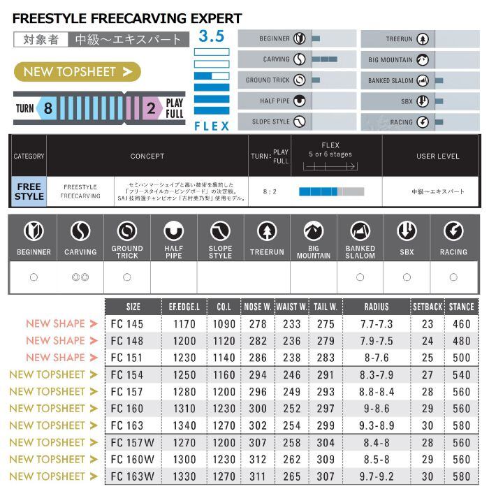 メーカー希望小売価格はメーカーカタログに基づいて掲載しています商品説明モデル名OGASAKAFC定価:115000+(税)サイズ154 , 157 , 160 , 163モデルFC商品説明セミハンマーシェイプと高い技術を集約した「フリースタイルカービングボード」の決定版。SAJ技術選チャンピオン「 吉村美乃梨」 使用モデル。「FC」は、現存モデルの中で最も古く、今も進化を続けるカービング系フリースタイルボードです。最大の特徴である「セミハンマーヘッド形状」により全長に対して有効エッジが長く、エッジグリップやターン時において抜群の安定感を発揮。フリースタイルの自由度を好みながら、最近カービングを楽しむ割合が増えてきたという方におすすめのボードです。2022年と2023年に SAJ全日本スノーボード技術選手権フリースタイル男子で二連覇を達成した滝口雅司と同大会のフリースタイル女子で現在二連覇中の吉村美乃梨がメインで使用しているモデルです。25-26 モデルでは、全サイズともトップシートに高価なポリアミドを採用。フレックスバランスを調整して操作性を高めたほか、女子サイズ(145/148/151)は新型に加え、新開発のBXコアを採用しフルモデルチェンジ。扱いやすさに加え、しなやかでしっとりとした乗り心地のラグジュアリーなボードへと進化しました。構造キャンバー購入特典・プレチューン/WAX FUTUREサービス・オリジナルソールカバー・デッキシート・ショートビス(15.5mm)上記から2 点■プレチューンとは?NEW BOARDのエッジ角の変更、エッジの立て直し調整、ベースWAXを行い、BOARDの性能を100%引き出すためのチューニングです※注意事項●返品について●お客様都合によるご注文後の返品・キャンセル・交換は一切受け付けておりませんので、予めご了承下さい。●商品画像について●撮影状況、PC状況により、色合いが若干異なる場合がありますので、ご了承の上ご購入ください。●商品欠品について●掲載されている全ての商品は実店舗・他のネットショッピングでも販売しております。ご注文を承り次第在庫を確保しますが、完売の際はご容赦下さい。 ●送料について●北海道・沖縄・離島等の場合、別途送料が必要となります。