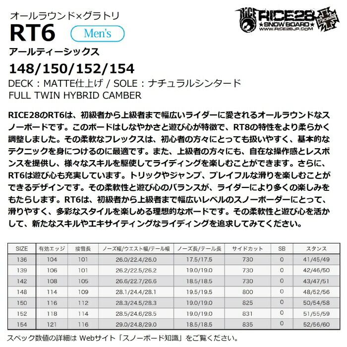 メーカー希望小売価格はメーカーカタログに基づいて掲載しています商品説明モデル名RICE28RT6定価:99800+(税)サイズ148 , 150 , 152 , 154モデルRT6商品説明RICE28のRT6は、初級者から上級者まで幅広いライダーに愛されるオールラウンドなスノーボードです。このボードはしなやかさと遊び心が特徴で、RT8の特性をより柔らかく調整しました。その柔軟なフレックスは、初心者の方々にとっても扱いやすく、基本的なテクニックを身につけるのに最適です。また、上級者の方々にも、自在な操作感とレスポンスを提供し、様々なスキルを駆使してライディングを楽しむことができます。さらに、 RT6は遊び心も充実しています。トリックやジャンプ、プレイフルな滑りを楽しむことができるデザインです。その柔軟性と遊び心のバランスが、ライダーにより多くの楽しみをもたらします。RT6は、初級者から上級者まで幅広いレベルのスノーボーダーにとって、滑りやすく、多彩なスタイルを楽しめる理想的なボードです。その柔軟性と遊び心を活かして、新たなスキルやエキサイティングなライディングを追求してみてください。形状ハイブリッドキャンバー選べる 特典・プレチューン/WAX FUTUREサービス・オリジナルニットソールカバー・デッキシート・ショートビス(15.5mm)■プレチューンとは?NEW BOARDのエッジ角の変更、エッジの立て直し調整、ベースWAXを行い、BOARDの性能を100%引き出すためのチューニングです※注意事項●返品について●お客様都合によるご注文後の返品・キャンセル・交換は一切受け付けておりませんので、予めご了承下さい。●商品画像について●撮影状況、PC状況により、色合いが若干異なる場合がありますので、ご了承の上ご購入ください。●商品欠品について●掲載されている全ての商品は実店舗・他のネットショッピングでも販売しております。ご注文を承り次第在庫を確保しますが、完売の際はご容赦下さい。 ●送料について●北海道・沖縄・離島等の場合、別途送料が必要となります。