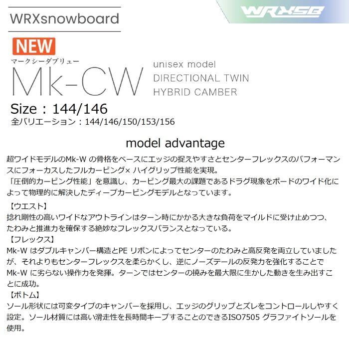 メーカー希望小売価格はメーカーカタログに基づいて掲載しています商品説明モデル名WRX snowboardMk-CW定価:121000+(税)サイズ144 , 146モデルMk-CW商品説明超ワイドモデルのMk-W の骨格をベースにエッジの捉えやすさとセンターフレックスのパフォーマンスにフォーカスしたフルカービング× ハイグリップ性能を実現。「圧倒的カービング性能」を意識し、カービング最大の課題であるドラグ現象をボードのワイド化によって物理的に解決したディープカービングモデルとなっています。形状ハイブリッドキャンバー選べる 特典・プレチューン/WAX FUTUREサービス・オリジナルニットソールカバー・デッキシート・ショートビス(15.5mm)■プレチューンとは?NEW BOARDのエッジ角の変更、エッジの立て直し調整、ベースWAXを行い、BOARDの性能を100%引き出すためのチューニングです※注意事項●返品について●お客様都合によるご注文後の返品・キャンセル・交換は一切受け付けておりませんので、予めご了承下さい。●商品画像について●撮影状況、PC状況により、色合いが若干異なる場合がありますので、ご了承の上ご購入ください。●商品欠品について●掲載されている全ての商品は実店舗・他のネットショッピングでも販売しております。ご注文を承り次第在庫を確保しますが、完売の際はご容赦下さい。 ●送料について●北海道・沖縄・離島等の場合、別途送料が必要となります。