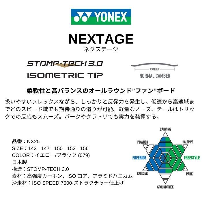 メーカー希望小売価格はメーカーカタログに基づいて掲載しています商品説明モデル名YONEXNEXTAGE定価:89000+(税)サイズ143 , 147 , 150 , 153 , 156カラーイエロー/ブラック概要柔軟性と高バランスのオールラウンド”ファン”ボード扱いやすいフレックスながら、しっかりと反発力を発生し、低速から高速域までどのスピード域でも期待通りの滑りが可能。軽量なノーズ、テールはトリックでの反応もスムーズ。パークやグラトリでも実力を発揮する。詳細日本製構造:STOMP-TECH 3.0素材:高強度カーボン、ISO コア、アラミドハニカム滑走材:ISO SPEED 7500?ストラクチャー仕上げ※注意事項●返品について●お客様都合によるご注文後の返品・キャンセル・交換は一切受け付けておりませんので、予めご了承下さい。●商品画像について●撮影状況、PC状況により、色合いが若干異なる場合がありますので、ご了承の上ご購入ください。●商品欠品について●掲載されている全ての商品は実店舗・他のネットショッピングでも販売しております。ご注文を承り次第在庫を確保しますが、完売の際はご容赦下さい。 ●送料について●北海道・沖縄・離島等の場合、別途送料が必要となります。