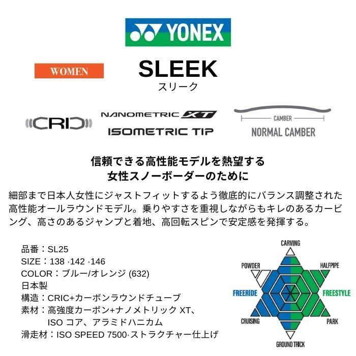 メーカー希望小売価格はメーカーカタログに基づいて掲載しています商品説明モデル名YONEXSLEEK定価:95000+(税)サイズ138 , 142 , 146カラーブルー/オレンジ概要信頼できる高性能モデルを熱望する女性スノーボーダーのために細部まで日本人女性にジャストフィットするよう徹底的にバランス調整された高性能オールラウンドモデル。乗りやすさを重視しながらもキレのあるカービング、高さのあるジャンプと着地、高回転スピンで安定感を発揮する。詳細日本製構造:CRIC+カーボンラウンドチューブ素材:高強度カーボン+ナノメトリック XT、ISO コア、アラミドハニカム滑走材:ISO SPEED 7500?ストラクチャー仕上げ※注意事項●返品について●お客様都合によるご注文後の返品・キャンセル・交換は一切受け付けておりませんので、予めご了承下さい。●商品画像について●撮影状況、PC状況により、色合いが若干異なる場合がありますので、ご了承の上ご購入ください。●商品欠品について●掲載されている全ての商品は実店舗・他のネットショッピングでも販売しております。ご注文を承り次第在庫を確保しますが、完売の際はご容赦下さい。 ●送料について●北海道・沖縄・離島等の場合、別途送料が必要となります。
