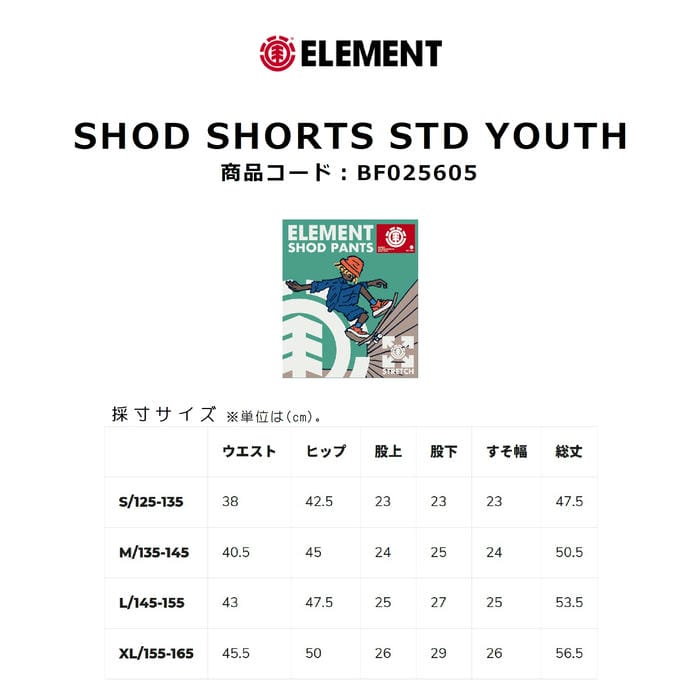 メーカー希望小売価格はメーカーカタログに基づいて掲載しています商品説明モデル名ELEMENTSHOD SHORTS STD YOUTH定価:5400+(税)サイズS , M , L , XLカラーBDM , BEG , FBK , MIU , RIG概要優れた伸縮性とワイドなシルエットで多くのスケーターに指示されているSHOD PANTS REGULAR。バックにはELEMENTのロゴがあしらわれた赤いパッチワーク。ELEMENTがスタンダードとする、ワイドでありながらテイパードしたシルエット。ウエストオールゴムで、4ポケット、フロント右ポケットにはELEMENTロゴを刺繍。脇にロゴネームを挟み込んでいる。お子様でも簡易的に操作できるウエストゴムのストッパー付き仕様。素材表地 綿98% ポリウレタン2%※注意事項●返品について●お客様都合によるご注文後の返品・キャンセル・交換は一切受け付けておりませんので、予めご了承下さい。●商品画像について●撮影状況、PC状況により、色合いが若干異なる場合がありますので、ご了承の上ご購入ください。●商品欠品について●掲載されている全ての商品は実店舗・他のネットショッピングでも販売しております。ご注文を承り次第在庫を確保しますが、完売の際はご容赦下さい。 ●送料について●北海道・沖縄・離島等の場合、別途送料が必要となります。