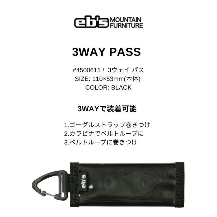 メーカー希望小売価格はメーカーカタログに基づいて掲載しています商品説明モデル名eb's3WAY PASS定価:1300+(税)サイズ110×53mm(本体)カラーBLACK概要3WAYで装着可能1.ゴーグルストラップ巻きつけ2.カラビナでベルトループに3.ベルトループに巻きつけ※注意事項●返品について●お客様都合によるご注文後の返品・キャンセル・交換は一切受け付けておりませんので、予めご了承下さい。●商品画像について●撮影状況、PC状況により、色合いが若干異なる場合がありますので、ご了承の上ご購入ください。●商品欠品について●掲載されている全ての商品は実店舗・他のネットショッピングでも販売しております。ご注文を承り次第在庫を確保しますが、完売の際はご容赦下さい。 ●送料について●北海道・沖縄・離島等の場合、別途送料が必要となります。