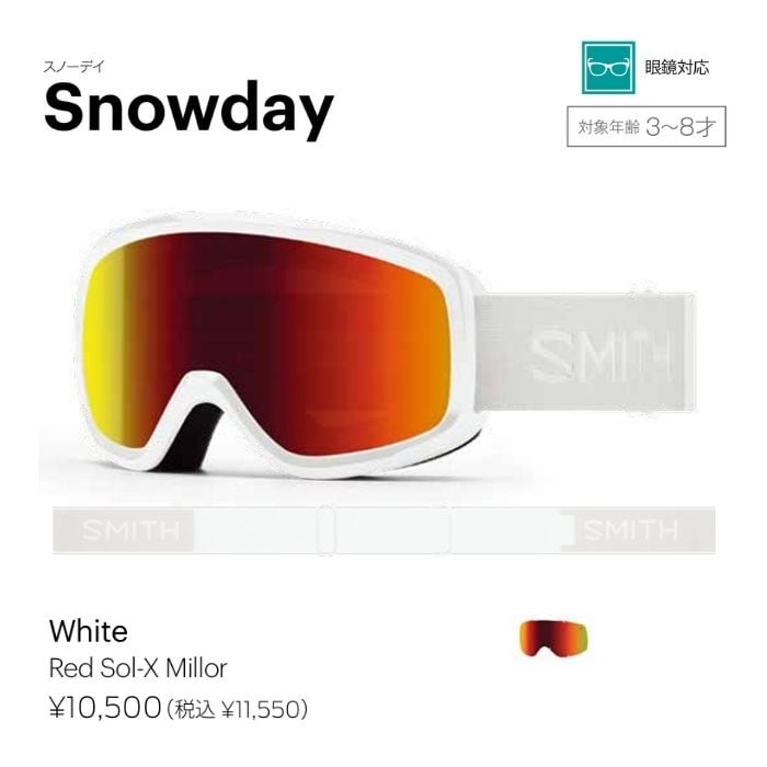 メーカー希望小売価格はメーカーカタログに基づいて掲載しています商品説明モデル名SMITHSNOWDAY定価:10500+(税)モデルSNOWDAYフレームカラーWhite詳細GamblerをアップデートしたSnowday。Gamblerでは物足りなかったKidsたちのために全ての機能をアップグレード。ポリカーボネイト素材の球面カーボニックXアウターレンズとインナーレンズのFog Xトリートメントがクリアな視界を実現。フェイスフォームは2レイヤーになり、ストラップも滑り止めシリコンが加わった。眼鏡対応。※注意事項●返品について●お客様都合によるご注文後の返品・キャンセル・交換は一切受け付けておりませんので、予めご了承下さい。●商品画像について●撮影状況、PC状況により、色合いが若干異なる場合がありますので、ご了承の上ご購入ください。●商品欠品について●掲載されている全ての商品は実店舗・他のネットショッピングでも販売しております。ご注文を承り次第在庫を確保しますが、完売の際はご容赦下さい。 ●送料について●北海道・沖縄・離島等の場合、別途送料が必要となります。