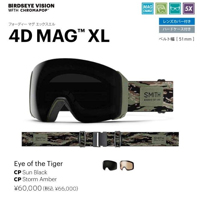 メーカー希望小売価格はメーカーカタログに基づいて掲載しています商品説明モデル名SMITH4D MAG XL定価:60000+(税)モデル4D MAG XLフレームカラーEye of the Tiger詳細要望の声も多く聞かれた4D MAG? XL。XLサイズでOTGに対応し、多くの眼鏡ユーザーにバードアイビジョンを体験してもらえることとなった。AirEvac?機能によりヘルメットとの通気問題もクリアにし、あなたにフォグフリービジョンを提供する。天候やコンディションに関わらず、簡単にレンズチェンジも可能でより広い視界をクロマポップの鮮明でクリアな世界へと導く。4D MAG?と比べて視界が13%アップした何にも阻まれない広い視界をぜひ体験して欲しい。クロマポップレンズ2枚標準装備。環境を考慮したサスティナブルパッケージ。レンズカバーが付属する。※注意事項●返品について●お客様都合によるご注文後の返品・キャンセル・交換は一切受け付けておりませんので、予めご了承下さい。●商品画像について●撮影状況、PC状況により、色合いが若干異なる場合がありますので、ご了承の上ご購入ください。●商品欠品について●掲載されている全ての商品は実店舗・他のネットショッピングでも販売しております。ご注文を承り次第在庫を確保しますが、完売の際はご容赦下さい。 ●送料について●北海道・沖縄・離島等の場合、別途送料が必要となります。