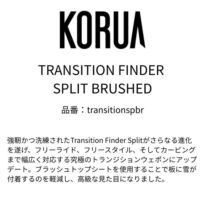 メーカー希望小売価格はメーカーカタログに基づいて掲載しています商品説明モデル名KORUATRANSITION FINDER SPLIT BRUSHED定価:120000+(税)サイズ150 , 157モデルTRANSITION_FINDER_SPLIT_BRUSHED概要強靭かつ洗練されたTransition Finder Splitがさらなる進化を遂げ、フリーライド、フリースタイル、そしてカービングまで幅広く対応する究極のトランジションウェポンにアップデート。ブラッシュトップシートを使用することで板に雪が付着するのを軽減し、高級な見た目になりました。詳細スリムなノーズシェイプはスキントラックをより快適に突き進み、中距離のワンデートリップやバックカントリーミッションにおすすめ。サーフィンにインスパイアされた新しいシェイプにはフリースタイルの要素をブレンドし、クリフやウィンドリップなどのナチュラルヒットで実力を発揮します。また改良されたノーズ幅によりエッジホールドも向上。テーパードシェイプやダイヤモンドテールは壁の当て込みやスイッチラインディング、キッカーでのテイクオフも得意とします。インナーエッジやスプリット専用のフレックスパターンによりツーリングモードや凍りついたトラバースでも最強のグリップを発揮します。ユニオン社製ノーズ&テールクリップ、ボレーインサートパターンを採用。ノーズホールはU-フックスキンマウンティングシステムに対応します。全てのテレインとライディングスタイルの欲望を満たす、究極のスプリットボードがTransition Finder Splitです。※注意事項●返品について●お客様都合によるご注文後の返品・キャンセル・交換は一切受け付けておりませんので、予めご了承下さい。●商品画像について●撮影状況、PC状況により、色合いが若干異なる場合がありますので、ご了承の上ご購入ください。●商品欠品について●掲載されている全ての商品は実店舗・他のネットショッピングでも販売しております。ご注文を承り次第在庫を確保しますが、完売の際はご容赦下さい。 ●送料について●北海道・沖縄・離島等の場合、別途送料が必要となります。