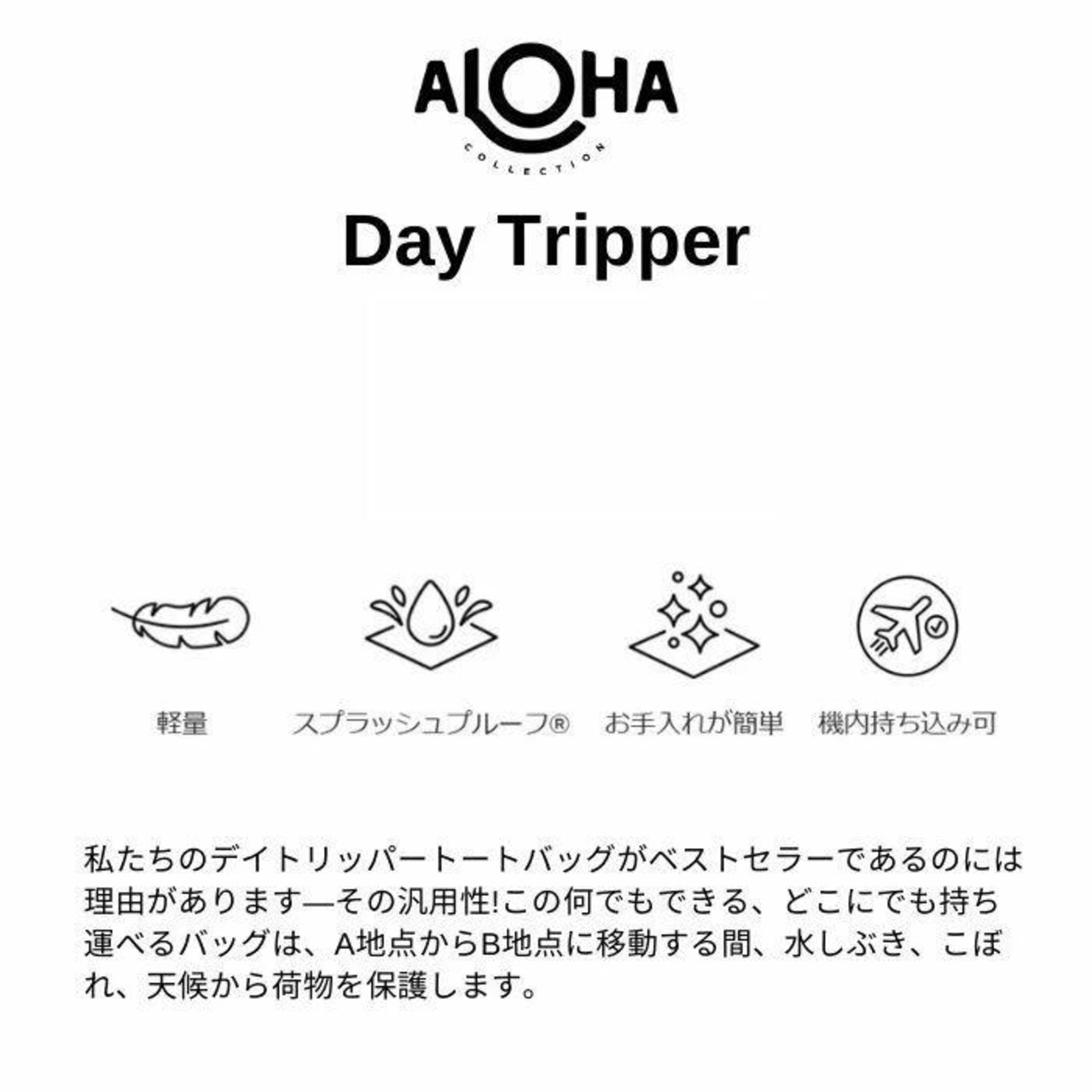 詳細 私たちのデイトリッパートートバッグがベストセラーであるのには理由があります—その汎用性。この何でもできる、どこにでも持ち運べるバッグは、A地点からB地点に移動する間、水しぶき、こぼれ、天候から荷物を保護します。