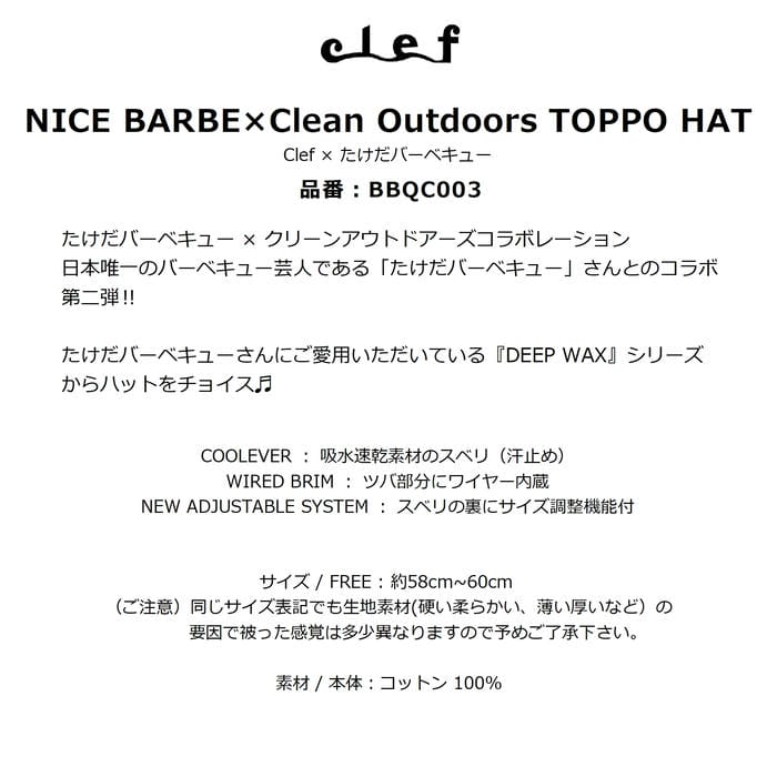 Clef NICE BARBExClean Outdoors TOPPO HAT BBQC003 ハット たけだバーベキュー ディープワックス 吸収速乾素材汗止め サイズ調整 ワイヤー内蔵つば クレ 正規品